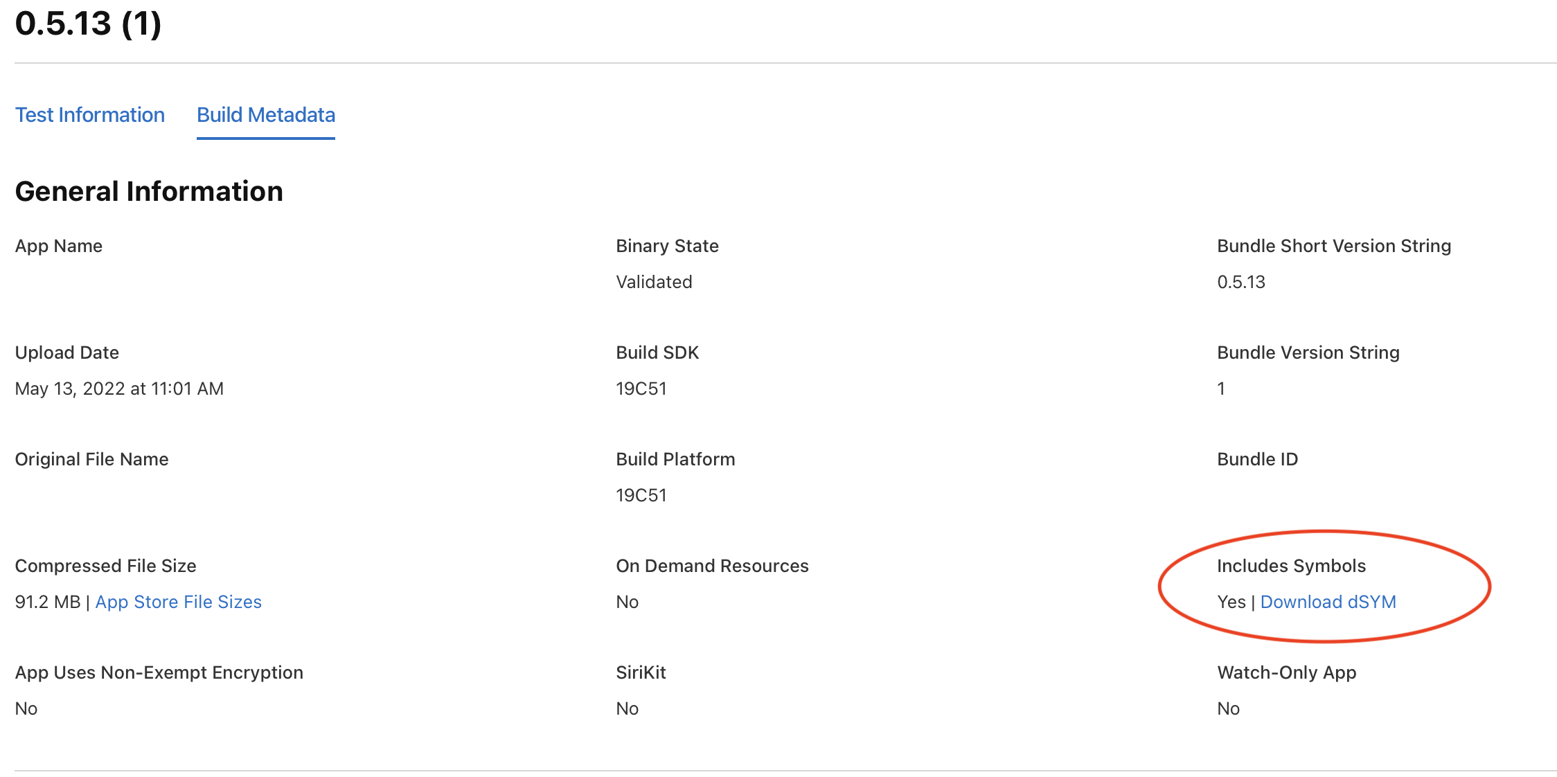 先上傳到 TestFlight 後,手動至 App Connect 在上傳的 Build 的 Metadata 頁面下 dSYM 檔案